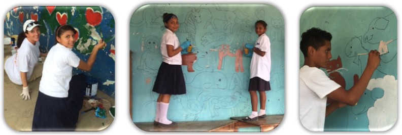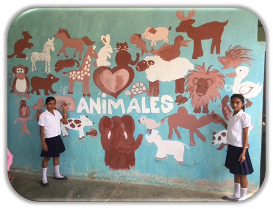 In her own words: "On our way to the school, we stopped by the paint store in the town near our hotel, and to my great dismay, the store only had two colors available: brown and white. Not good for my image of a colorful mural! The teachers had requested a mural of animals, so with a Sharpie marker (that I totally wore out), I sketched outlines of animals on the cinder block wall. The younger children watched, but I asked the older students if they wanted to help me. Since I was now a three-time visitor, the shyness was gone and they all volunteered. The excitement was in the air!